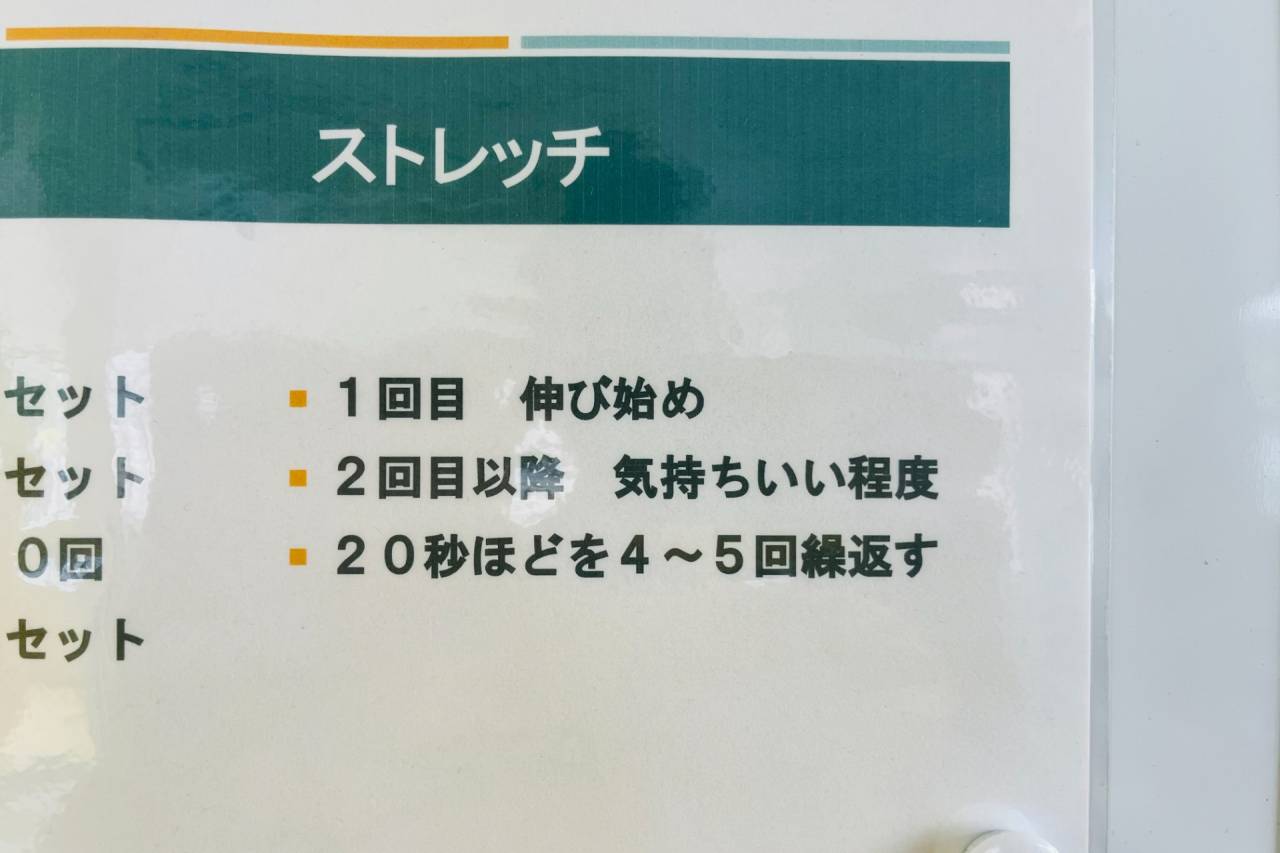 そんなストレッチには大きく2つあり、一般的にストレッチと言われるものは静的(スタティック)ストレッチと言われる種類のストレッチになります。最初に出てきたストレッチという言葉も静的ストレッチを指して書いたものです。こちらは運動前よりも後、そして日常的に行うことによって柔軟性の高い身体がつくられ怪我の防止、運動パフォーマンスの向上ができます。ただしターゲットする筋肉によって正しい行い方があるのでぜひ一度聞いてください。そして強さと時間ですが、強すぎて短く行う方が非常に多いのですがストレッチは優しく長くが1番効くようです。静的ストレッチのポイントはホワイトボードに貼っているので参考にしてみてください。